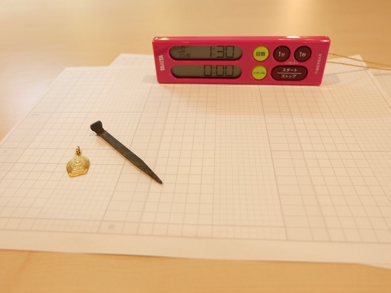 択一演習のための用紙、時間と回数を設定できるタイマー、お守りにしていた祖父母の形見です。
