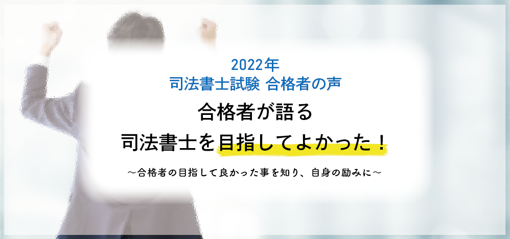 司法書士を目指してよかったという想いは、本当にあります。合格して受験時代と変わったことは、自分の強さと弱さを知ることができたことがひとつあります。そして、一番思ったことは、自分一人ではなく、多くの人に支えられて、毎日を生活することができているという、当たり前のことに気づくことができました。そのうえで、司法書士試験を目指すことができ、多くの人の支えによって目標とする合格をすることができたのだと、思っています。講師の皆さん、スタッフの皆さん、本当にありがとうございました。