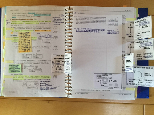 入門段階の勉強法はあまりにも時間がかかり、テキストを繰り返し読み込むことができず、また同じ勉強をしていては同じ結果しか得られないと考え、講義においては、テキストに記載されている内容以外の講師の言葉を中心に書き写し、また暗記する優先順位が区別できるようにマーカーで色分けをしていました。自宅では、優先順位に従って勉強するとともに、講義で学んだ論点の択一式の問題を一肢ずつ検討し、間違った選択肢については、テキストの該当ページの間に別紙を挟んで、すぐに確認できるよう選択肢を書き写していました。メインのテキストについては科目ごとに、自分の理解しやすいほうを選択して使用していました。そして、本番で択一式については基準点より10問以上、記述式については基準点以上に目標点を設定し、択一式に重きを置いて勉強を進めていました。