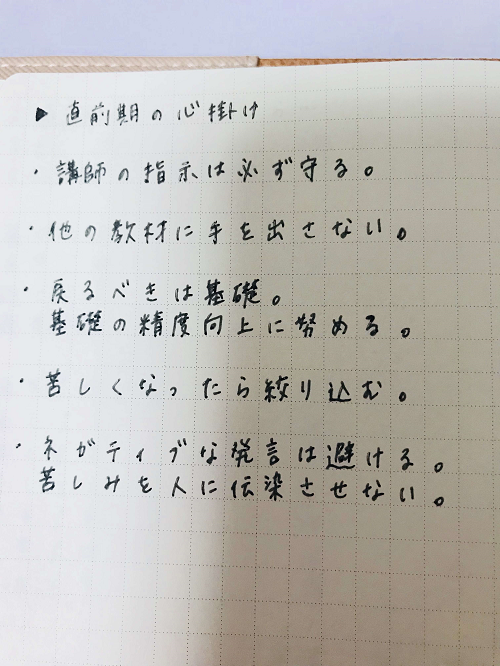 浮き沈みする直前期を乗り越えられるようにと手帳にメモした心掛けです。蛭町講師のお言葉も含まれています。