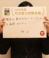 とにかく記述式に苦手意識を持っていた私が、本試験において記述式で高得点をとれるまでになれたのは、山村講師の指導のおかげです。山村講師の時には厳しく、熱いご指導を受けられたおかげで、記述式の解法のみならず、本試験での心構え、実務に出た時のイメージなど、本当にいろいろなことを学ぶことができました。