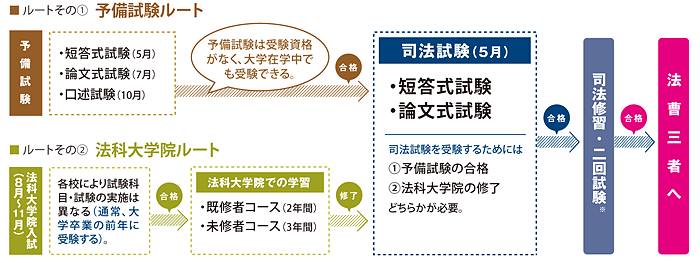 裁判官、検察官又は弁護士となろうとする者に、必要な学識・応用能力を備えているかどうかを判定するための国家試験であり、法科大学院課程の修了者及び司法試験予備試験の合格者を対象に行われます(予備試験は、法科大学院を経由しない者にも法曹資格を取得する途を開くために設けられるもので、これに合格した者も、法科大学院修了者と同等の資格で司法試験を受験することができます)。