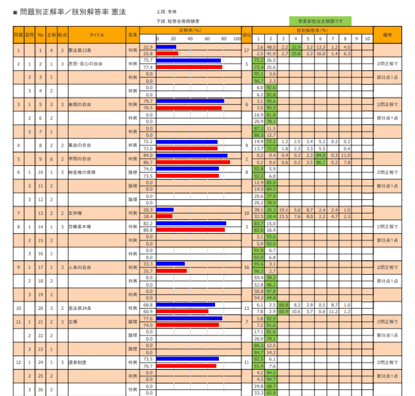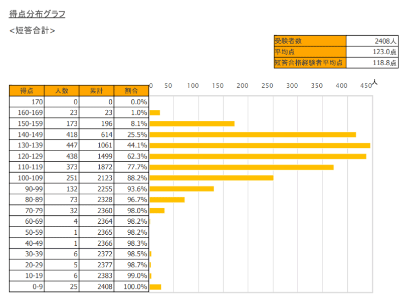 - 科目ごとの平均点、短答合格経験者平均点、短答合格経験者人数