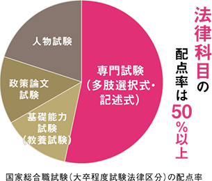 公務員の仕事を一言で表すと「法律を駆使し、時には法律をつくり、国や地域を動かしていく仕事」。中でも国家総合職試験の「法律区分」は最も採用人数が多く、法律知識の重要性はダントツ。採用試験にも多くの法律科目が課され、そのほとんどが予備試験と重なるため、予備試験に向けた法律学習が大きなアドバンテージになります。
