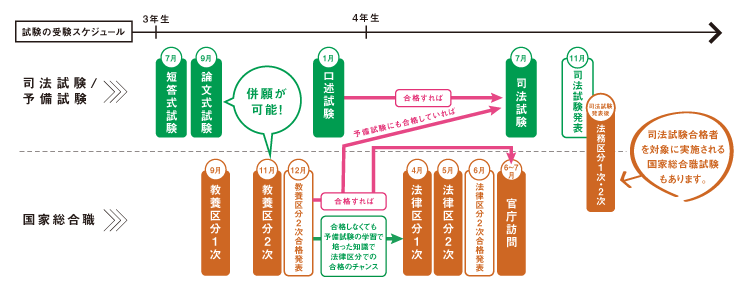 予備試験・司法試験と国家総合職試験は試験日程が重なることはありません。法律科目の対策は予備試験対策で十分であり、それ以外の試験科目についても、大学入試までに学習した内容(基礎能力)や社会で生起する出来事への日常的な関心(政策論文)で対処することが中心なので、学習負担が大きくなることもありません。