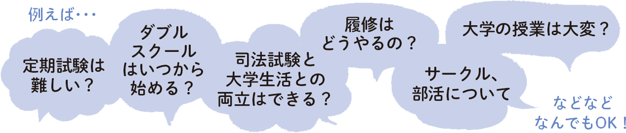 司法試験予備試験や公務員国家総合職試験に合格した先輩も参加してくれるので、大学生活のことだけでなく、将来のキャリアについても話が聞けます♪
