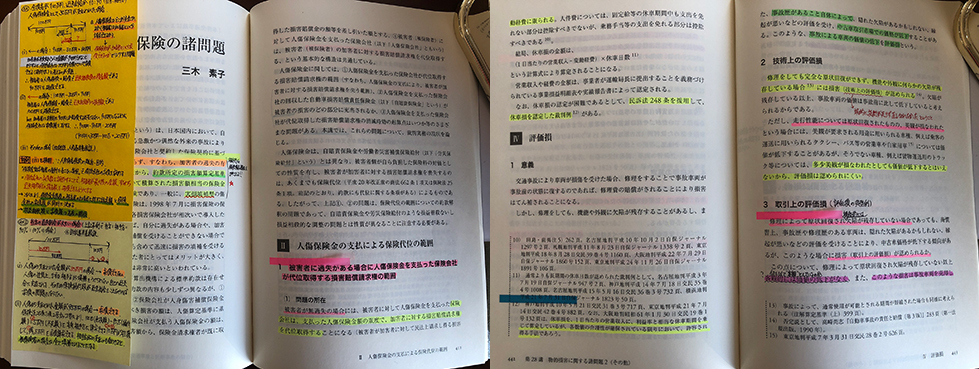 受験生時代を振り返ると、伊藤塾では呉先生のクラスで受講していて、色を変えて視覚で本が読めるようなテクニックを教わったのが役に立っています。今でも法律書を読むときはその読み方で、線を引いて読んでいます。役割のある色で線を引くというのは、自分の頭の中の整理の助けになりますし、1度色分けしておくと、再度読み返したときにも頭に入ってきやすいです。また、私が受験生時代につくった「受験対策ノート」(いわゆるまとめノート)があって、未だに見返すときがあります。