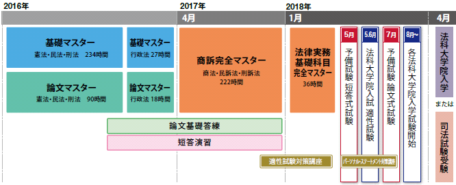 基礎マスターの段階から、論文答案作成を意識して講義を進めていきます。憲法・民法・刑法・行政法は基礎インプットの直後に論文アウトプットを、商法・訴訟法は基礎と論文を一気にと、科目特性に応じた効率的なカリキュラムを提供します。