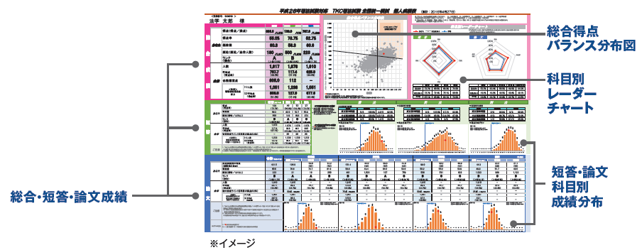受験生目線から、個人の成績データ、全体の中での位置を、より詳細に、わかりやすく、見やすいレイアウトで本試験へ向けた最後の分析を支えます。