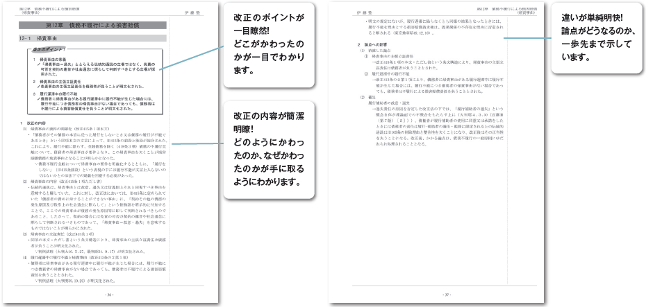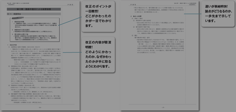 部会資料・最新の基本書等に基づき、改正の内容、論点への影響を、見やすく分かりやすく整理。改正条文の趣旨を詳解し、現行民法下で争いのあった事項への影響や今後の課題等について、一元化されたテキストでいち早く修得することができます。