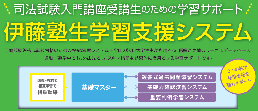 伊藤塾司法試験入門講座受講生の方は、「伊藤塾生学習支援システム」のお申込資格がございます。下記ご確認のうえ、ご利用をご希望の方は、本ページよりご購入ください。