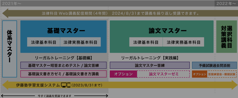 司法試験入門講座では、予備試験短答式試験合格のためのWeb演習システムに加え、全国の法科大学院生が利用している信頼と実績のリーガルデータベースをあわせて、「伊藤塾生学習支援システム」として、通勤/通学中でも、外出先でも、スキマ時間を効果的に活用できる学習サポートを実現します。