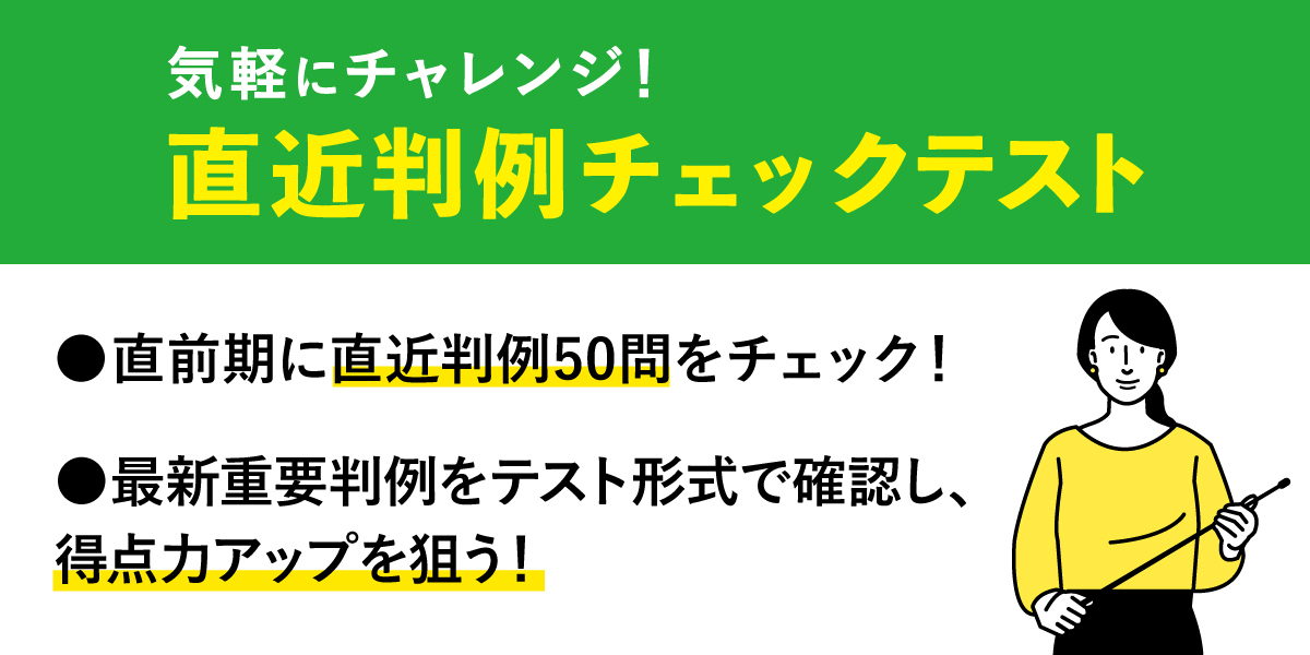 >基礎学習段階で学べていなかった新しい判例については、「直近判例チェックテスト」で補完できた。本試験でもチェックテストから出たから得点を積めて助かった。