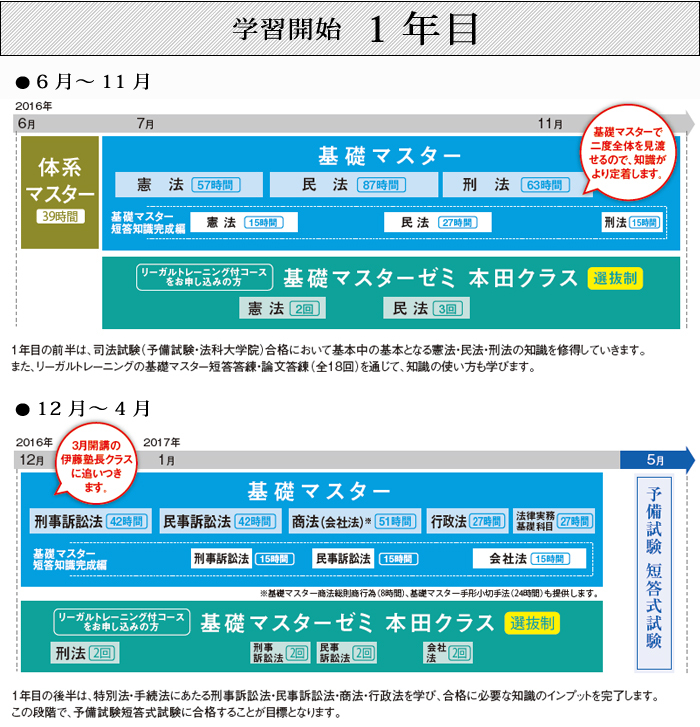 *ライブ講義1年目は体系マスター・基礎マスターについて、週3回・1回3時間が基本です。基礎マスター短答知識完成編・リーガルトレーニング基礎編を含めると、週4回となります。また、一部の講義はビデオ/インターネット受講となります。詳細は日程表をご確認ください。