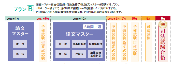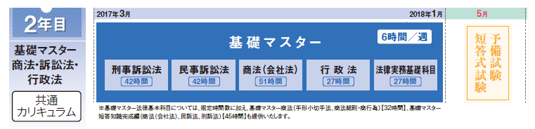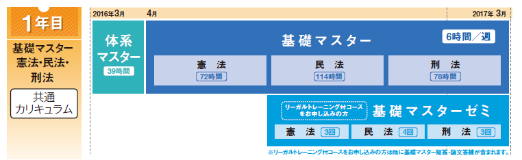 「ゴールからの発想」をもとに、司法試験合格の核となる基礎マスター憲法・民法・刑法をすべてをライブで受講できるように、水曜夜2時間、日曜昼4時間のスケジュールで年間を通します。