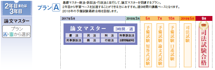 【2~3年目】は、論文マスターで、問題文の読み方や事案の分析、論点抽出の仕方、答案構成・表現手法を学習します。司法試験まで見据えた学習が完了し、いよいよ予備試験最終合格から司法試験合格を 目指します。