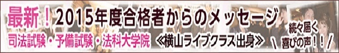 法曹人口が激増し就職難が叫ばれる今日でも、予備試験や司法試験上位合格者であれば希望どおりの職種で活躍している現実を踏まえ、予備試験・司法試験上位合格を勝ち取るための徹底した指導を展開する。学習初期段階から知識の単なるインプットにとどまらず、論文問題の答案作成を通じ、盤石な法的知識・思考力の土台を初学者でも無理なく構築するノウハウを有する。特筆すべきは、自身で答案作成を個別指導を行い、1年後には、少なくとも憲法・刑法の論文合格答案を作成できるレベルへ到達させる。横山クラスは、毎年一ケタ・二ケタ順位の高位合格者を多数輩出し続けているだけでなく、一ケタ順位合格者のノートを後輩の勉強に役立てるなど、クラスОB・OGが一体となって受験生を応援している。企業倒産・国賠訴訟を中心に実務家としても活躍する横山講師の話から元気をもらった合格者からは、「合格までのモチベーションが保てる」「気弱になると先生の話を思い出した」など感謝の声が多数寄せられている。