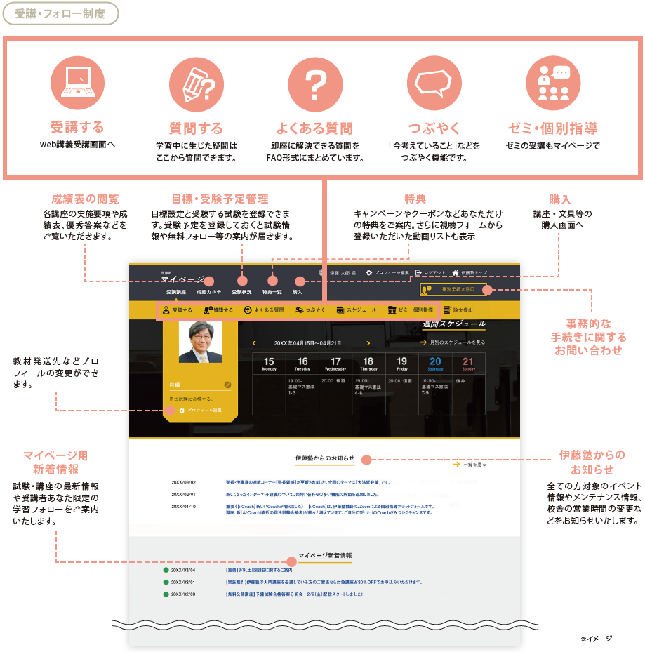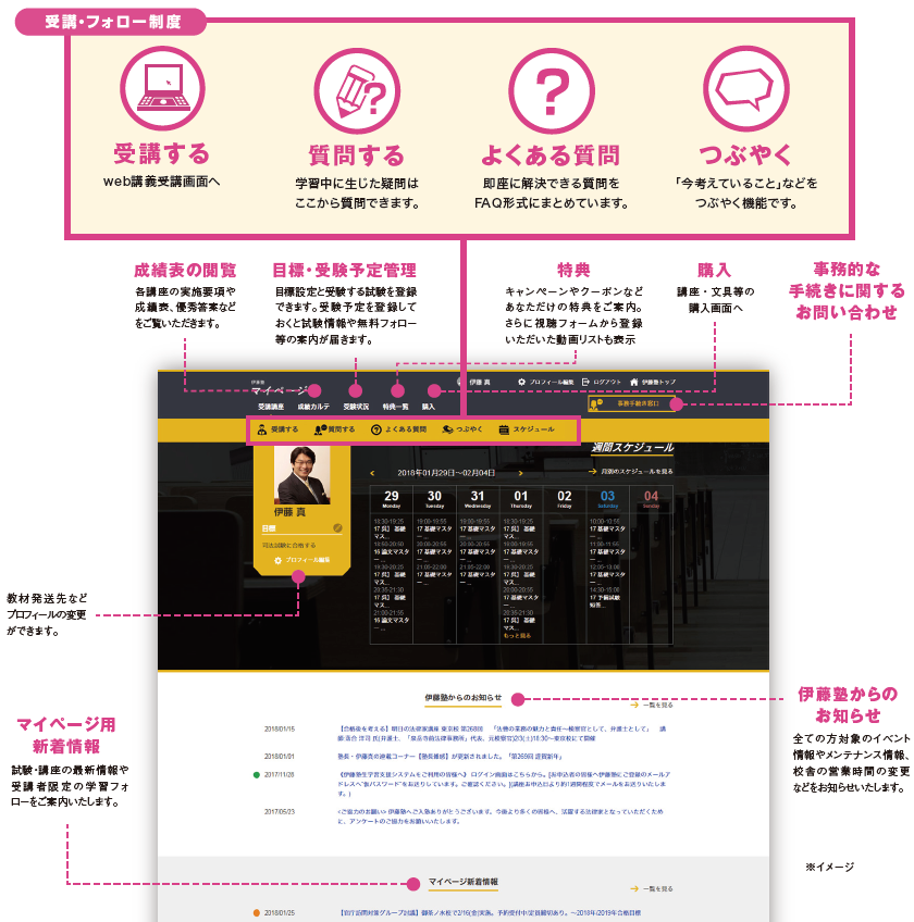 伊藤塾のWeb学習フォローシステムです。受講生一人ひとりに専用の「マイページ」が開設され、受講中の講義に関するお知らせや、学習に必要な情報を“ご自分の専用ページ”で確認できます。