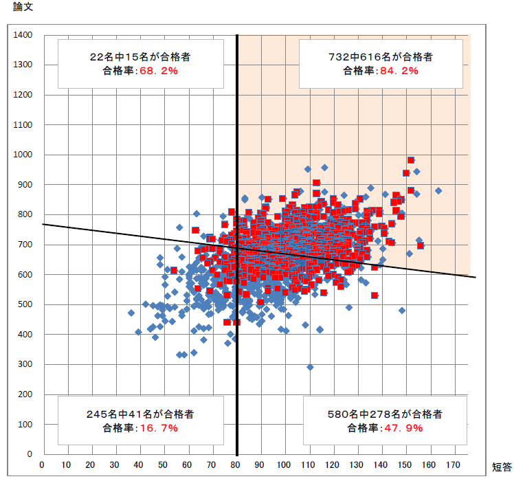 TKC全国統一模試で、「短答の合格推定ライン以上」かつ「論文・短答の合格推定ライン以上」の成績であった方々=下表内の右上オレンジ色エリア