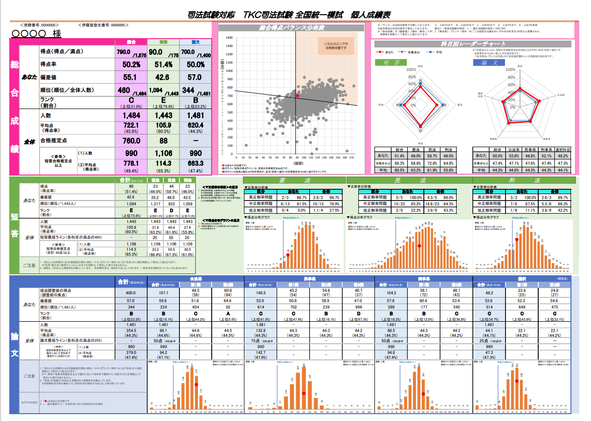 試験前に受験生の中での自分の位置づけを確認することができますし、何より採点が丁寧で、どの部分に何点入るのかが明確になります。この、どの部分に点数が入るかを知ることはとても重要です。なぜなら、司法試験では1点が勝負を決めることも多いからです。