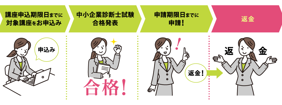 2026年2月3日(火)までに対象講座をお申し込みされた方が、2026年2月4日(水)の合格発表を受けて2025年度中小企業診断士試験に合格し、講座の受講が不要になった場合に、受講料を全額返金(※)させていただく制度です。
