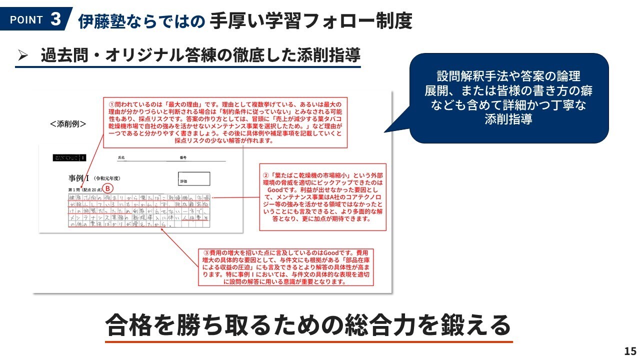 伊藤塾では、ゼミの講師が課題について全問添削を行います。これにより、答案の癖や弱点を早期に発見し、合格に向けての正しい努力を積み重ねることが可能になります。