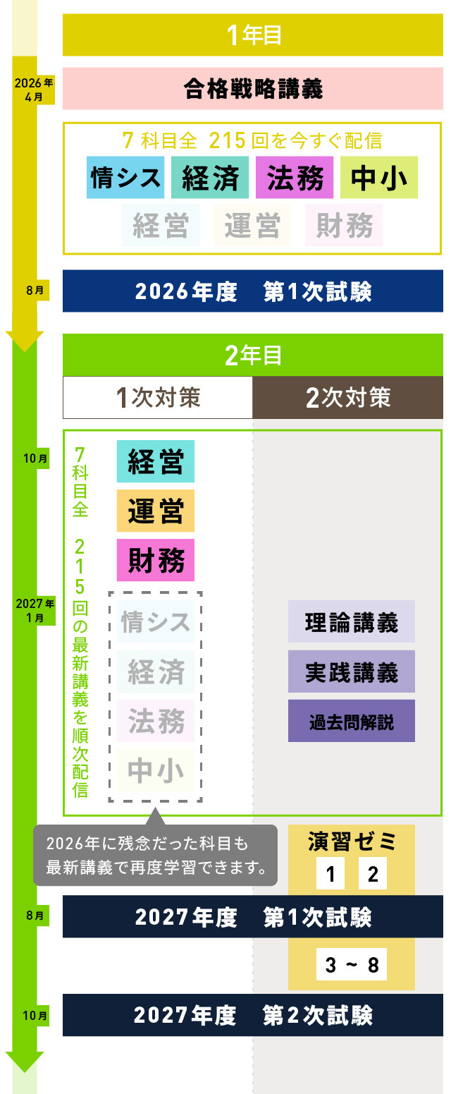2027年1月から「2次理論講義」および「2次過去問解説講義」を開講し、2027年度1次試験の前から「演習ゼミ」がスタートするため、2027年度試験の2次対策にも十分な期間と量を確保できます。