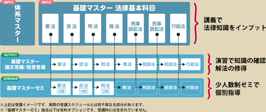 「基礎マスターゼミ」(憲法・民法・刑法 全10回)はリーガルトレーニング[基礎編]に含まれている、入門講座カリキュラムの一環です。